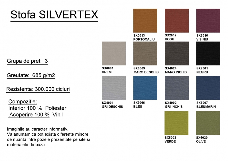 Fotoliul este tapitat cu piele ecologica, material textil sau piele naturala, intr-o varietate coloristica mare.