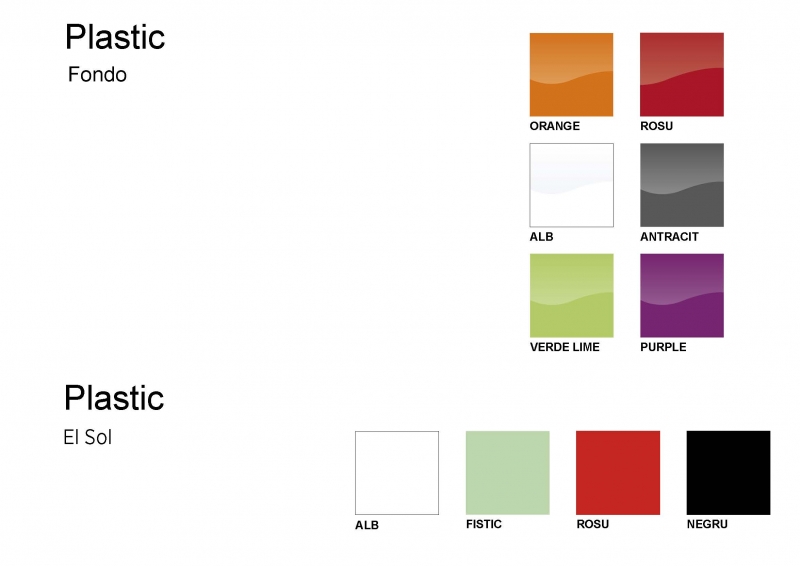 Scaunul de bucatarie este disponibil in sase variante de culori: gri antracit, verde dechis-lime, portocaliu, rosu, violet, si crem.